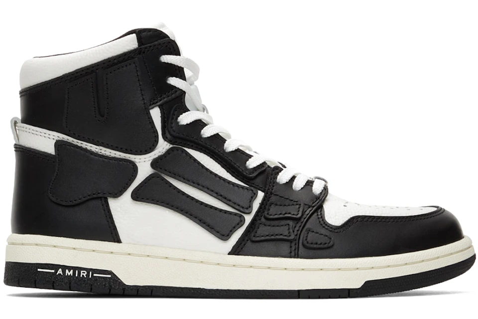 The shoe features a white leather base with premium black leather overlays. Resting atop the leather foundation is an array of leather patches that holistically resemble the bone-anatomy of a foot.